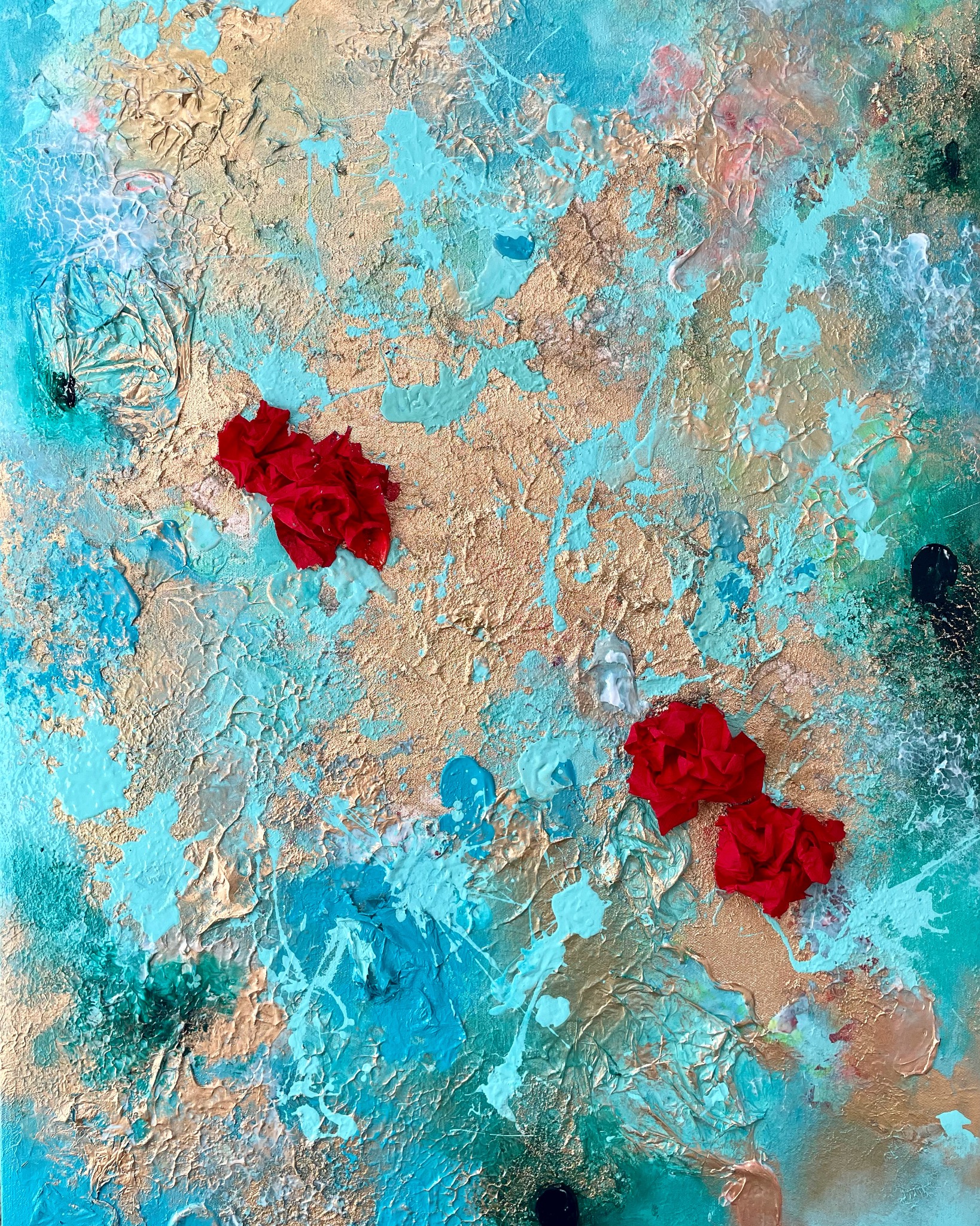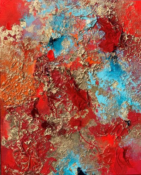 The artist explores human attributes of emotion and energy in a visual representation of abstraction through variations of colour compliments and contrast, bold texture and placement.